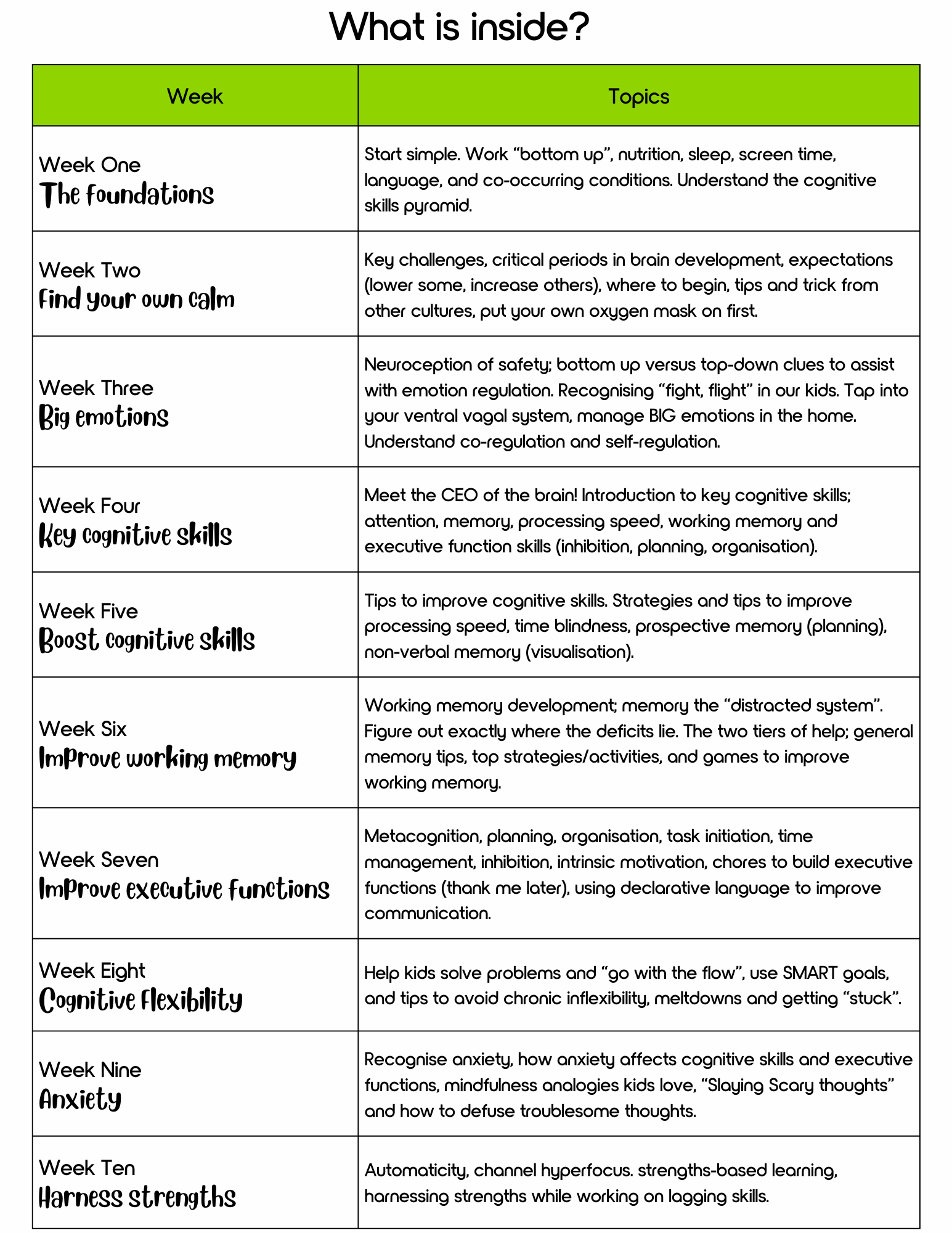 This is not a course for kids. Rather it is designed for busy parents who want to boost executive function skills in the home in a fun, practical and manageable way. The content of the course is also very relevant to teachers or other professionals working with children (speech pathologists, OTs, and psychologists).